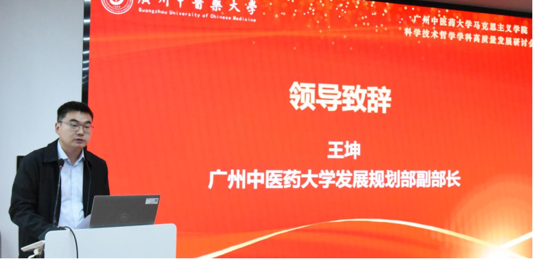接着,广州中医药大学发展规划部副部长王坤发表致辞。王部长首先对本次会议的召开表达了祝贺,也对各位专家的带来表达了感谢。接着,他指出,科技哲学作为连接科技前沿与人文价值的重要纽带,是高校学科生态扩容的关键抓手,也是服务国家战略、回应时代命题的重要理论支点。他强调,广州中医药大学作为中医药院校,科技哲学学科要办出"中医药味儿",要围绕中医药伦理规范、智能诊疗的技术边界、医学人文的历史谱系等关键议题,深化科技哲学与中医药内涵的深度融合,推动中医药理论体系与现代哲学话语体系的互鉴共生,让科技哲学讲中医药的故事、解中医药的难题。他提出,我们要以科技哲学为桥梁,联动马克思主义理论、医学人文、中医药学、人工智能等多学科,破解学科孤岛的困局,为学校双一流建设注入跨学科动能。与此同时,学校也将搭建相应的平台、对接校外资源,为学科的高质量发展创造更大空间。最后,王部长期待各位专家的携手同行,共同打造具有中医药特色的科技哲学学科发展前景。