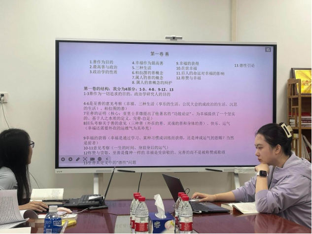 首先,郑晓如老师对《尼各马可伦理学》第一卷[善]的内容和逻辑进行了大致的梳理,开启了本次读书会的序幕。领读学生钟小燕对第一卷的基本内容和重要概念如善、幸福、德性活动等进行了逻辑的分析,为本次研读内容提供了总体认识。接下来,每位同学针对所选择重点内容进行了详细分析。