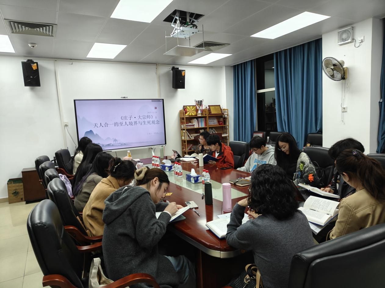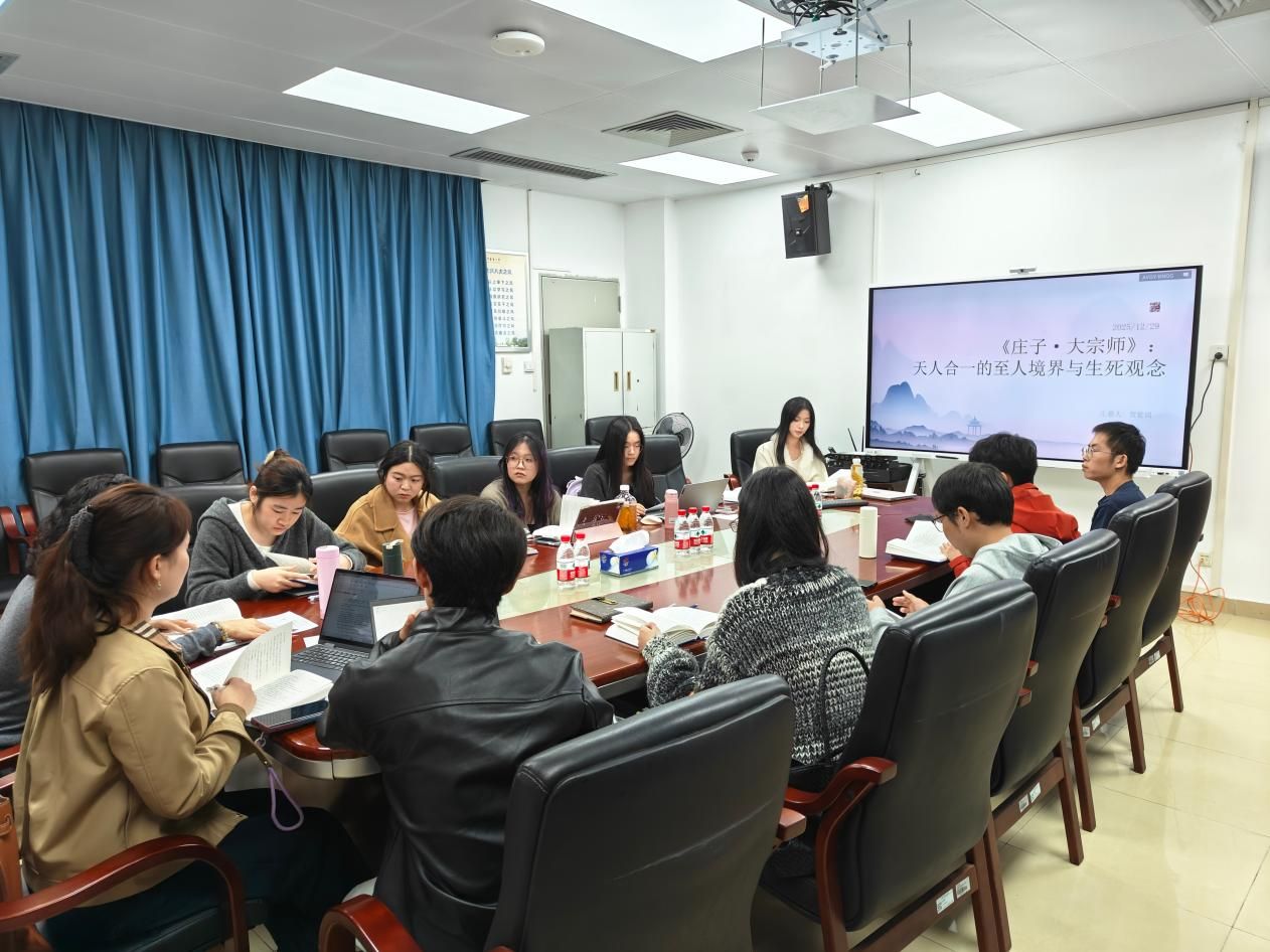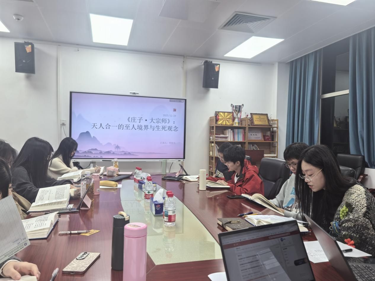 2025年12月29日晚,马克思主义学院第十一期“随・意”研究生读书会于人文楼 403 室如期开展。本次活动由邢华平老师和陈萃韧老师共同担任领读教师,2025 级科学技术哲学专业全体研究生参与。读书会以《庄子・内篇》之《大宗师》与《应帝王》为核心研读文本,围绕 “体道修身” 与 “无为治世” 两大核心议题,深入探析庄子哲学的精神内核与实践智慧,展开了多维度、深层次的学术交流。
