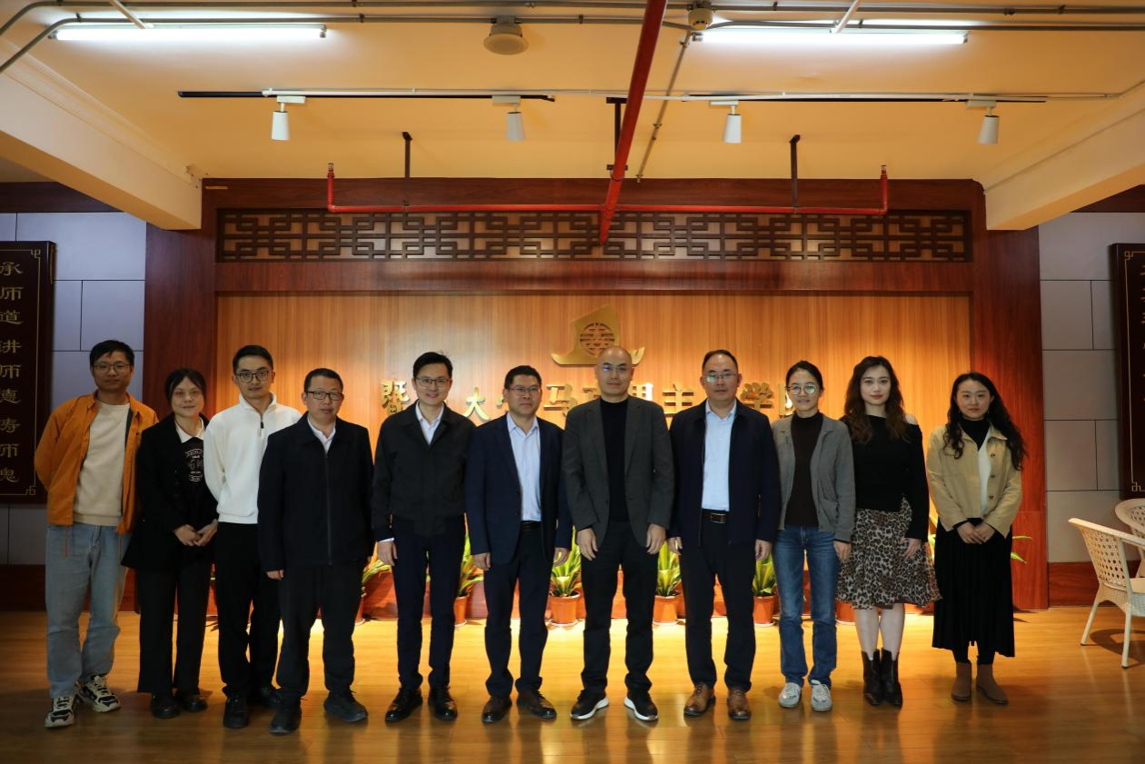 为学习借鉴暨南大学马克思主义学院在港澳台学生国情教育领域的先进经验与成熟做法,进一步提升我校港澳台学生国情教育质量,打造具有中医药特色的国情教育体系。2025年12月31日上午,我校马克思主义学院党委书记龚建文、副院长林志彬带领学院骨干教师武香兰、马千隽、刘鹏及学校教务部教学质量控制科科长邓成方、国际学院辅导员李姣等一行赴暨南大学马克思主义学院开展专题调研。暨南大学马克思主义学院副院长何小勇、张龙平等领导及教授郭海宏、史怀刚等教师代表热情接待我校调研团队,双方围绕核心议题展开深入交流。