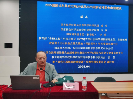 为进一步夯实我院国家社科基金申报基础,增强项目竞争实力,促进人文社会科学高质量发展,2026年4月23日下午,由广州中医药大学马克思主义学院主办的国家社科基金申报专题指导会在大学城校区人文楼102会议室举行。会议邀请东北大学陈凡教授作题为《关于国家社科基金申报的若干问题》专题讲座。社会科学部副部长饶远立、党委办公室副主任肖建喜、马克思主义学院党委书记龚建文、副院长曾庆娣及各学院师生代表共同参会。讲座由曾庆娣副院长主持。