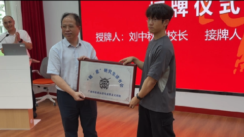在授牌仪式环节,刘中秋副校长作为授牌人,向2025级研究生袁翰超同学授予“随·意”读书会牌匾。仪式庄重而简朴,标志着读书会正式成立,也体现了学校对马克思主义学院研究生教育工作的高度重视。袁翰超同学作为学生代表接受牌匾,展现了新一代学子的责任意识与担当精神。