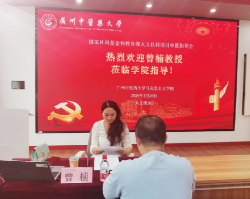 为帮助学院教师提升国家社科基金和教育部人文社科项目申报质量,2026年3月26日下午,马克思主义学院组织召开项目申报指导会,邀请广州大学马克思主义学院院长赵中源教授、南方医科大学马克思主义学院院长曾楠教授、广东财经大学马克思主义学院院长孙晓晖教授担任指导专家。三位专家为学院本年度拟申报相关项目的教师提供了专业指导。辅导会由曾庆娣副院长主持。